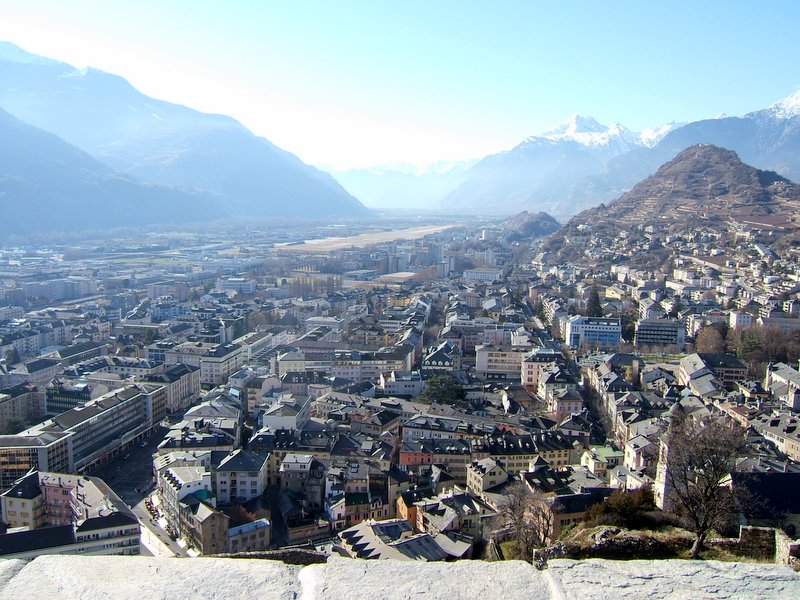 After walking through that entryway, this view of Sion opens up. Martigny is near the top center of the picture on the left.
