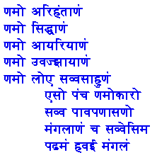 Namo ariha.ntaaNaM Namo siddhaaNaM Namo aayariyaaNaM Namo uvajjhaayaaNaM Namo loe savvasaahuNaM eso pa.ncha Namokaaro savva paavapaNaasaNo ma.ngalaaNaM cha savvesim paDhamaM hava{ii} ma.ngalaM |