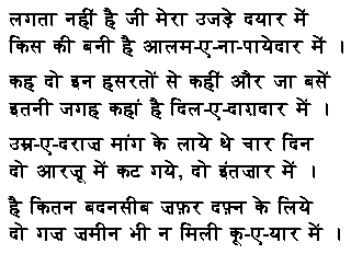 lagataa nahii.n hai jii meraa uja.De dayaar me.n kis kii banii hai aalam\-e\-naa\-paayedaar me.n kah do in hasarato.n se kahii.n aur jaa base.n itanii jagah kahaa.n hai dil\-e\-daaGadaar me.n umr\-e\-daraaz maa.ng ke laaye the chaar din do aarazU me.n kaT gaye do i.ntazaar me.n hai kitana badanasiib zafar dafn ke liye do gaz zamiin bhii na milii kU\-e\-yaar me.n |
