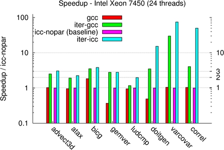 For the Xeon and Opteron machines, the iterative process outperforms ICC 10 with auto-parallelization, with a factor between 1.2x for gemver on Intel to 15.3x for doitgen. For both of these kernels, we also compared with an implementation using Intel Math Kernel Library (MKL) 10.0 and AMD Core Math Library (ACML) 4.1.0 for the Xeon and Opteron machines respectively, and we obtain a speedup of 1.5x to 3x over these vendor libraries.