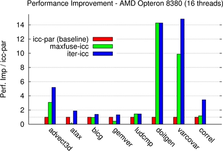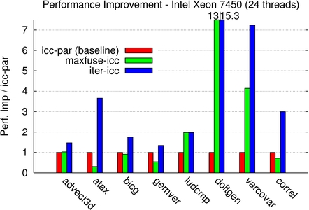 For varcovar, our technique outperforms the native compiler by a factor up to 15x. Although maximal fusion significantly improved performance, the best iteratively found fusion structure allows for a much better improvement, up to 1.75x better. Maximal fusion is also outperformed for all but ludcmp and doitgen for some machines only. This highlights the power of the method to discover an efficient balance between parallelism (both coarse-grain and fine-grain) and locality.