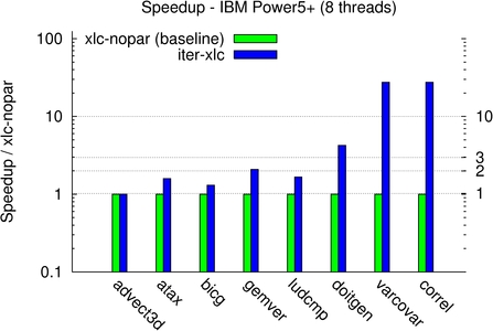 On the Power5+ machine, on all but advect3d the iterative process outperforms XLC with auto-parallelization, by a factor between 1.1x for atax to 21x for varcovar.